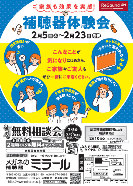 【2/10開催】認定補聴器技能者による相談会を開催します☆☆☆ ー メガネ・補聴器のミラール上尾店