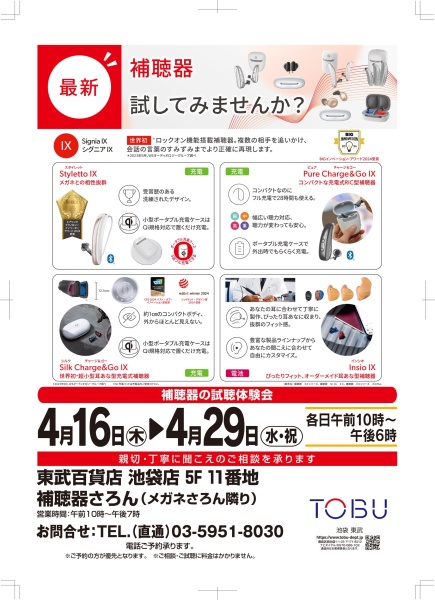 東武百貨店池袋店5階11番地補聴器さろんでは、『補聴器の試聴体験会』を開催いたします。