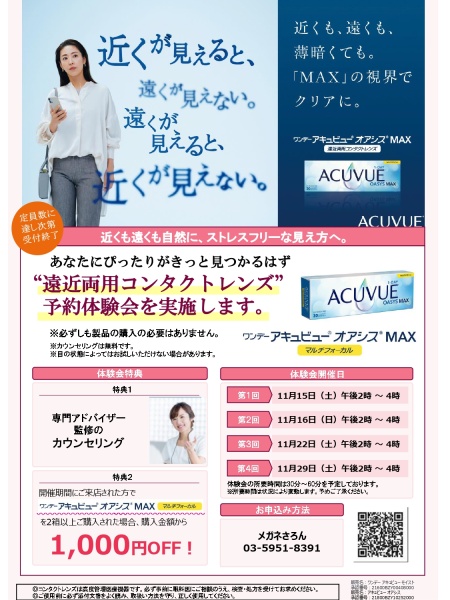 東武百貨店池袋店5階11番地メガネさろん・コンタクトレンズルームでは、働き盛りの疲れ目世代を応援する“遠近両用コンタクトレンズ予約体験会”を開催いたします。 当店はターミナルの百貨店内ですので、お仕事帰りやお買い物のつい […